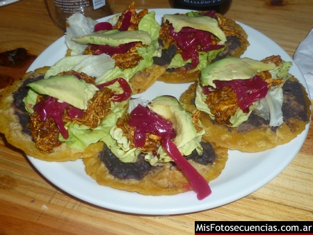…y Salbutes con frijoles negros, lechuga, pollo desmechado, cebolla morada y palta.
