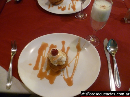 De postre nos sirvieron Picarones, compuesto de dos anillos de harina de trigo mezclada con zapallo. Se podría definir como algo muy similar a un buñuelo, pero en forma de anillo. El postre se sirve tibio y con una bocha de helado arriba que genera un contraste realmente interesant, una cereza adornando y pintado con una suerte de miel o caramelo (aunque no sea estrictamente esto).