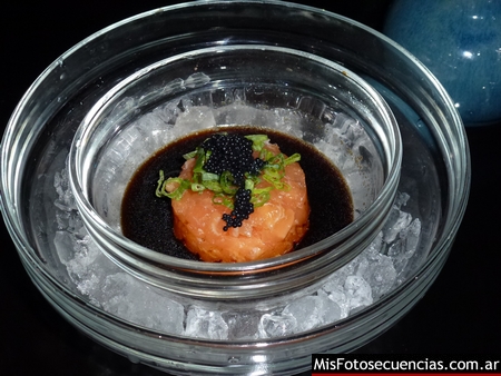 Rocamadour presentó quizás la propuesta más sofisticada de la noche con una degustación de entradas que incluyó salmón rosado en dos presentaciones, con caviar negro y luego sellado con aceite de sésamo y semillas de sésamo.