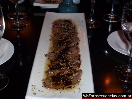 La entrada continuó con lomo sellado, tal como el salmón, con aceite de sésamo y presentado con semillas también de sésamo y camarón tempurado en dos presentaciones.