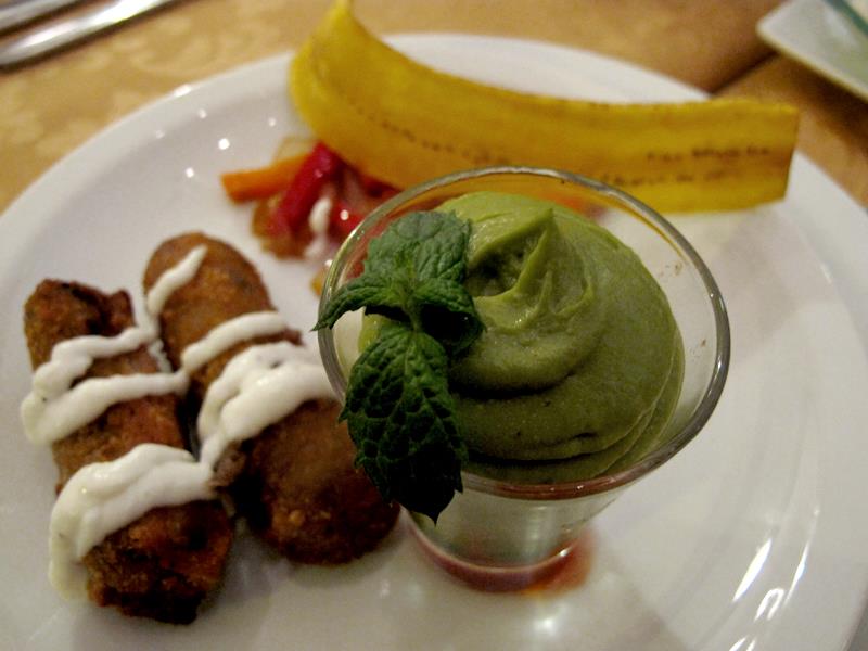 La entrada fue una degustación de platos de la isla. Por un lado unas croquetas, vegetales salteados con plátano frito y un shot de vegetales, camarones salteados y crema de palta, acompañados de un trago que viene funcionando muy bien en el restaurante y fue el favorito en el stand de Cuba en la Fiesta de las Colectividades, Hemingway.