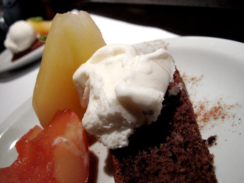 El postre, peras al vino blanco, peras en reducción de Campari y biscuit de almendras y cacao con helado de crema. Realmente una delicia.