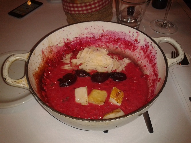 Mi elección de esta vez en María Antonieta Resto fue Risotto de remolacha, queso de cabra gratinado y tomillo ($118), que lo sirven en el cacharro de metal en el que se cocina, directo de la hornalla a la mesa, y una copa de vino Doña Paula($27). El risotto estuvo muy bien en términos de sabores y textura pero el aspecto no fue para nada amigable, al punto de que al subir una foto a mi cuenta de Instagram llegaron a describirlo como «vómito de borracho«… y si, no puedo negar que algo de razón tiene.