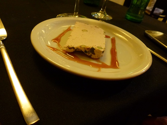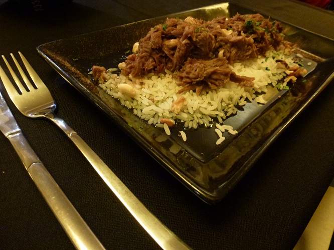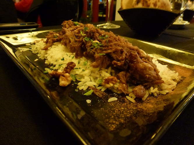 El principal fue Cordero a la Medio Oriente ($66). Un abundante plato de cordero desmenuzado aromatizado con siete especias, nueces y castañas sobre una base de arroz que fue sin dudas lo mejor de la noche. Es un plato intenso pero con una abundante cantidad de arroz que armoniza la carga de sabores.