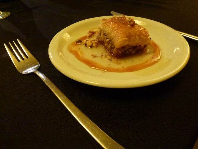 El postre fue un clásico, Baclawa ($21). Un pequeño bocadillo de masa filo relleno de nueces con almíbar y agua de azahar que mantuvo el nivel de los platos que pude probar.