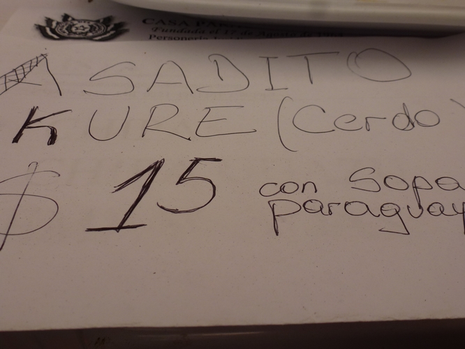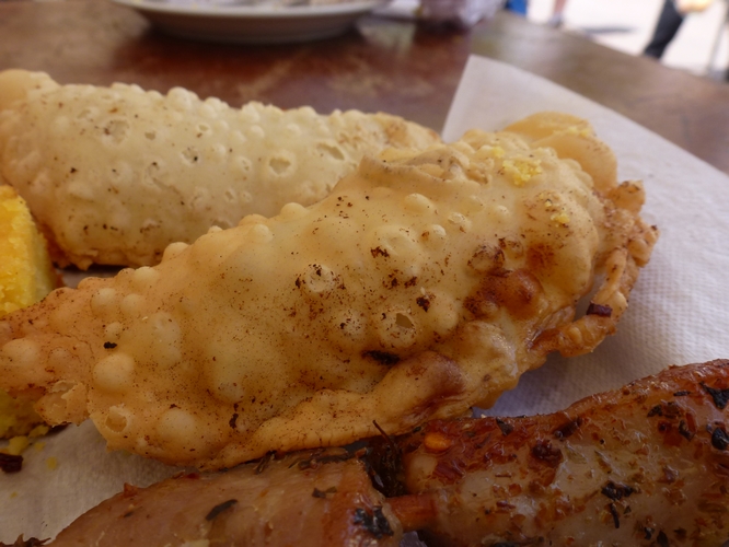 Pese a que mi paso por la feria debía ser breve y que a esta altura ya tenía un sabor amargo en la boca, me detuve en el stand de Paraguay para probar las empanadas que recomendó «Juanito» en la nota de Día a Día. Además pedí «Asadito Kuré», un brochette de cerdo acompañado de sopa paraguaya y mientras esperaba mi porción me obsequiaron un pedazo de chipa, todo impecable. Pese a que también sufrían la falta de infraestructura, pulgares arriba para los hermanos paraguayos.