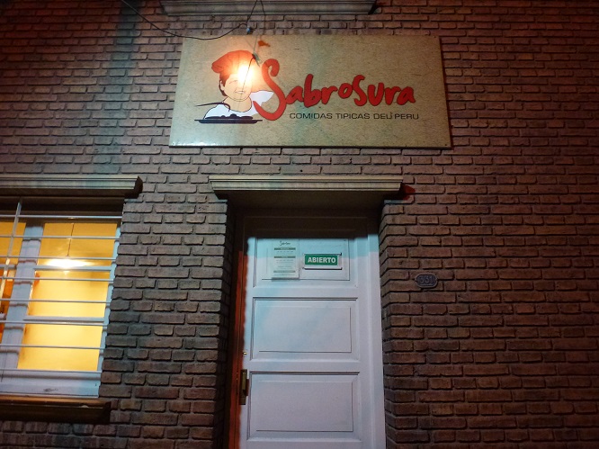 Sabrosura es un restaurante de cocina peruana en Guaymallén, Mendoza, al que llegué pidiendo recomendación vía Twitter. Llegué a este dato preguntando “donde comer bueno, bonito y barato en Mendoza”, la recomendación llegó aclarando que es “bien de peruanos posta” pero despojado de todo lujo, protocolo y ceremonial. El restaurante funciona en un caserón ubicado en San Juan de Dios 331, esquina Adolfo Calle. De afuera solo puede verse una puerta cerrada con un cartel que indica que allí ofrecen verdadera cocina peruana. Adentro encontramos un par de mesas ocupadas por gente mirando un partido del seleccionado de Perú en la Copa América.