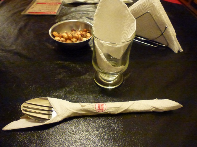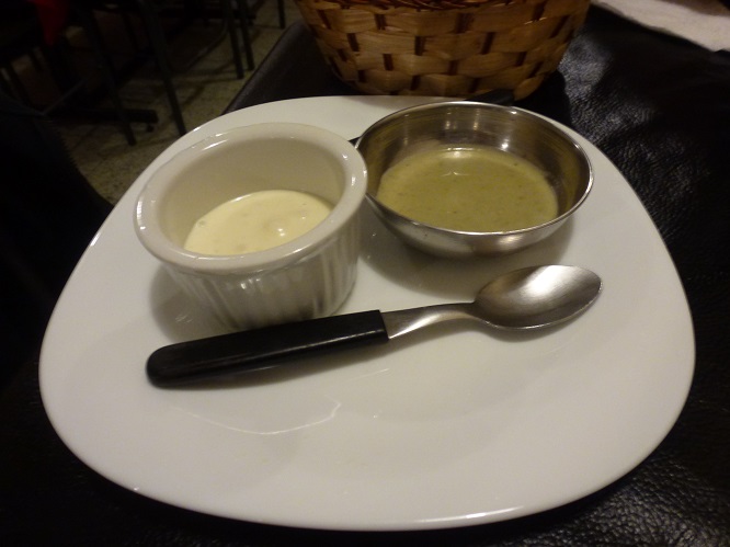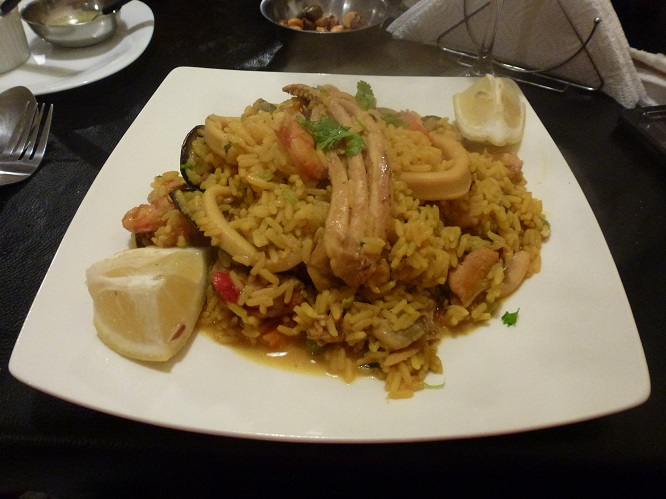 Al llegar, nos ubicamos, pedimos la carta y tras hacer un repaso general llamamos a la moza para conversar buscando alguna recomendación. Mientras leíamos la carta nos trajo las típicas canchitas, más pan con mayonesa y una salsa más picante que mil infiernos. Finalmente, la sugerencia de la casa fue Arroz con mariscos ($95), pese a encontrarse tachada en la carta la señorita confirmó que contaban con este plato e hizo hincapié en que lo probemos. Y así fue. El plato consiste en arroz aderezado con cebolla, vino blanco, arvejas y pimiento con mixtura de mariscos, mejillones, langostinos y almejas. Por la rapidez con que no sirvieron y la temperatura de los mismos dio la impresión de que ya tenían preparado el arroz, solo se maquilló el plato seguido de un golpe de microondas y listo. Demás está decir que en lo personal esta es una práctica que no es para nada de mi agrado. Al momento de pedir el vino también hubo un ida y vuelta por lo que terminamos la recomendación de la moza, no recuerdo bien que vino fue pero tuvo un costo de $75.