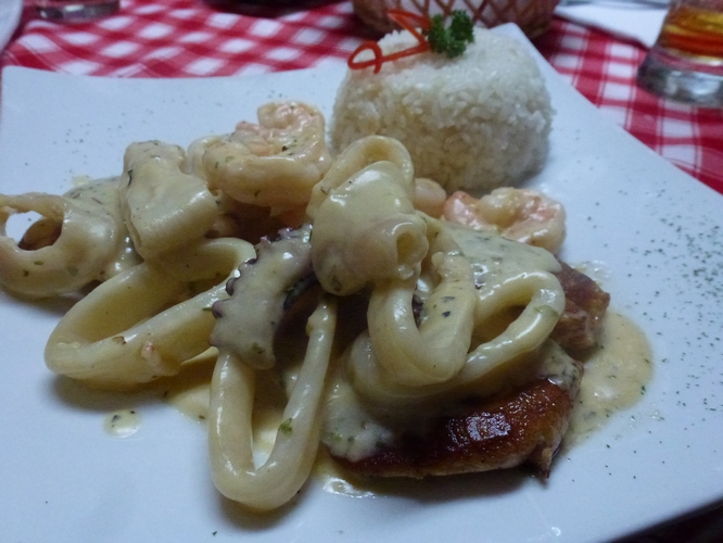El resultado fue un imponente plato de salmón. Un salmón delicioso, correctamente condimentado y recargado con un baño de mariscos acompañado de un timbal de arroz. Un plato realmente soberbio por $6600, aproximadamente unos $86 argentinos ya contemplado el cambio de moneda y el impuesto del 20% por compra en el exterior.