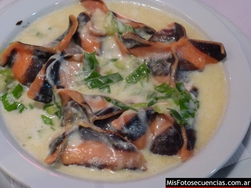 Sorrentinos de mar [$75]. Pastas rellenas de salmón rosado, camarones, mozzarella ahumada, cebolla, ricota y morrones, vino chardonnay y nueces, rociados con salsa de mejillones a la provenzal.
