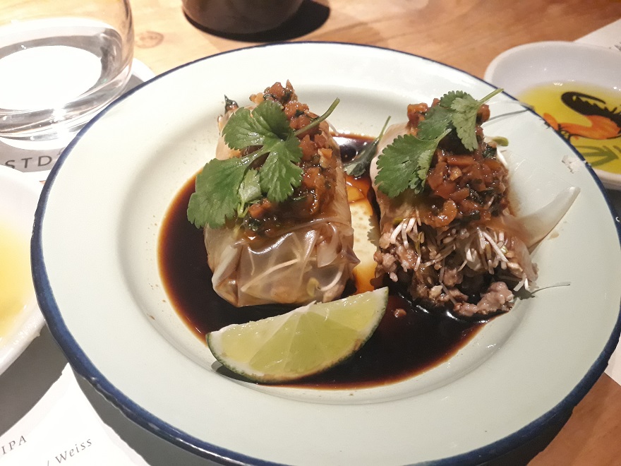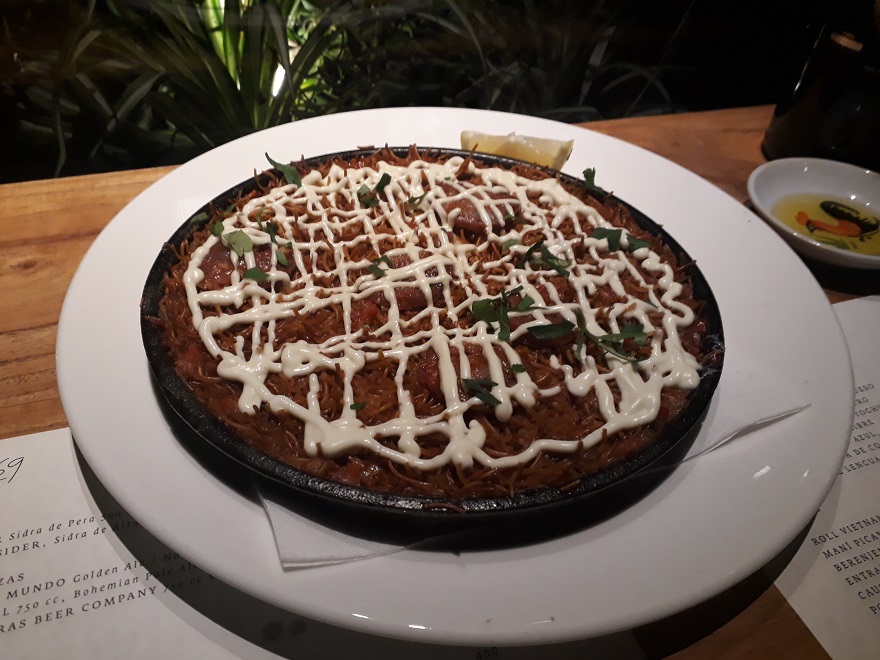 En primer lugar pedí Roll vietnamita de cerdo, brotes y tofu con salsa de maní picante ($160) y Fideuá de pollo, chorizo español y alioli de limón ($250). Ambos muy buenos pero el primero fue quizás el punto más alto de la noche y de las últimas cenas a las que fui en Córdoba.
