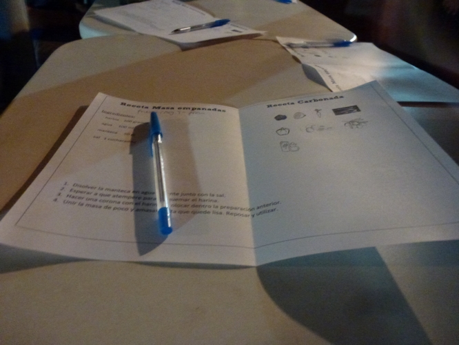 Para el taller los miembros de la organización entregan el material necesario para tomar anotaciones de recetas y procesos de elaboración/cocción.