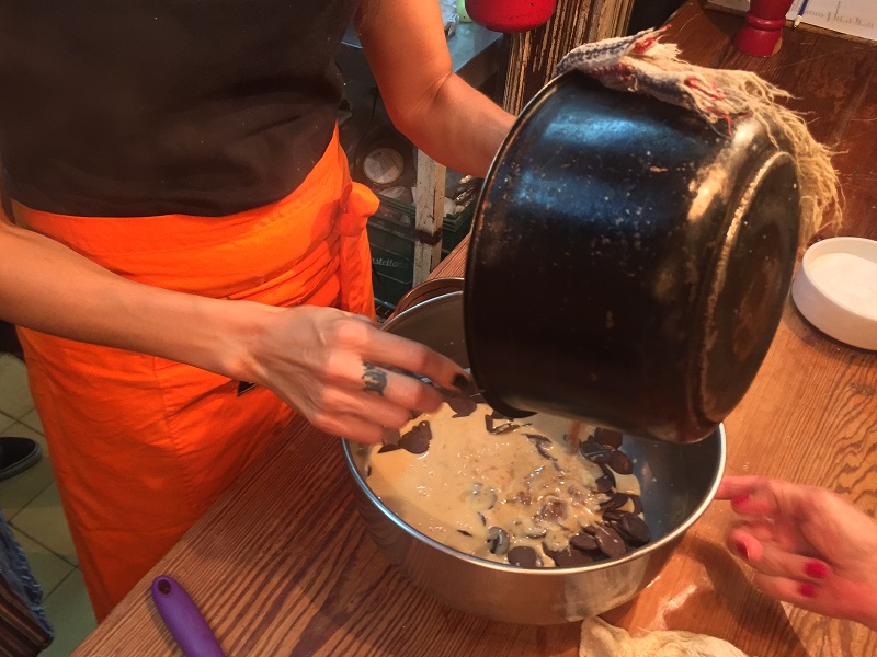 La clase no es unidireccional sino que se convierte en una gran conversación en la que todos ponen «las manos en la masa» en distintas estaciones de trabajo distribuidas por la propia cocina del restaurante y Paula solamente dirige al grupo.