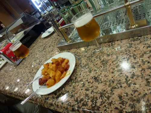 En primera instancia, mientras leía las opciones que ofrece la casa, pedí una caña cono para ir entrando en clima. Las cañas no son otra cosa que una pequeña copa de cerveza de barril, de la marca Amstel en este caso, que los españoles sirven siempre acompañado de algo para comer. De mayor o menor calidad, tamaño o precio pero siempre se sirven acompañadas de algo para comer.