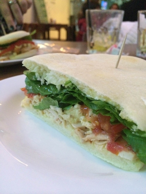 – Generoso sándwich de pollo en pan árabe tostado levemente, muy bien condimentado el pollo y bien crocante, rúcula, huevo y tomate, con un aderezo en base a queso crema. Además de los que figuran en la carta, podes combinar tus ingredientes y armar el que te guste más.