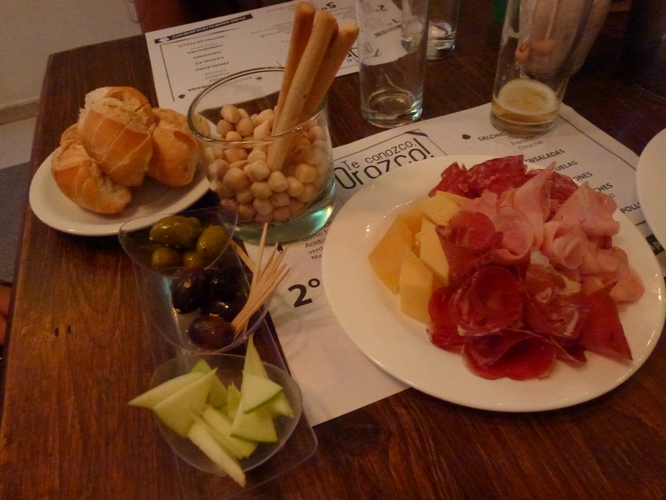 En esta ocasión pedimos una picada($160), la tercera, tal como lo define la carta, que llegó a la mesa con una presentación «cool» que le da una vuelta de tuerca a las típicas picadas que encontramos, por ejemplo, en Córdoba. Pulgares arriba a la presentación y a los componentes de la picada pero un detalle no menor es que uno de los ingredientes según rezaba la carta era almendras (o nueces, no recuerdo bien) pero al llegar a la mesa nos encontramos con unos pintorescos triangulitos de manzana verde. Y esto, repito, no es un detalle menor, porque como comenzal puedo entender que no dispongan de un producto (porque lo vendieron, precio, importación, desabastecimiento, whatever) pero no me gusta que me cambien lo que pedí sin avisar. Lisa y llanamente por eso, porque si pedí algo… es porque quiero comer eso que pedí.