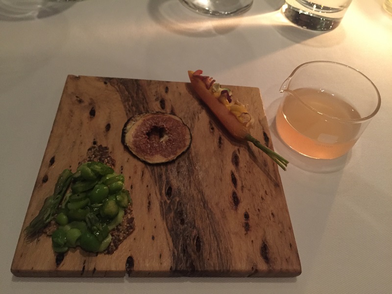 Galleta fermentada con arvejas, higos con kéfir y zanahoria acompañado de agua de tomate con lemongrass