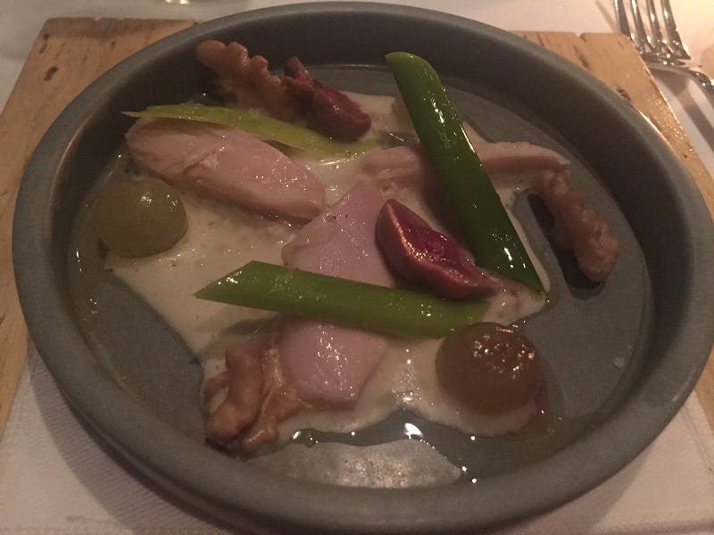Si tuviera en cuenta toda la experiencia lo mejor de la cena fue el maridaje entre el matambre de cerdo con merengue y polvo de vinagre y la tuna más la crema hecha con la cáscara de la tuna acompañado del vino Pulcu Selección Reserva 2013 de David Bonomi.