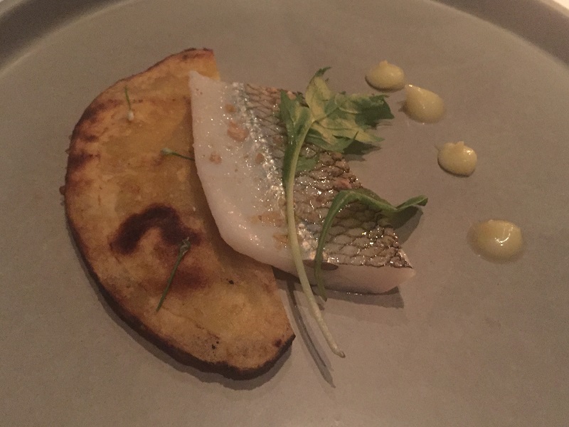 Pejerrey confitado al aceite de oliva con papas a la parrilla y emulsión de manteca y grasa de cerdo