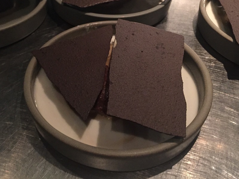 Chocolate ahumado con helado de dulce de leche, almendra fermentada y merengue cacao