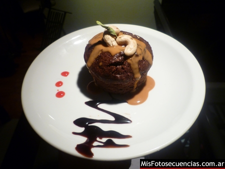 Torta húmeda de algarroba, castañas de cajú y cacao endulcorado con hojas de stevias y salsa de dulce de leche de cabra.