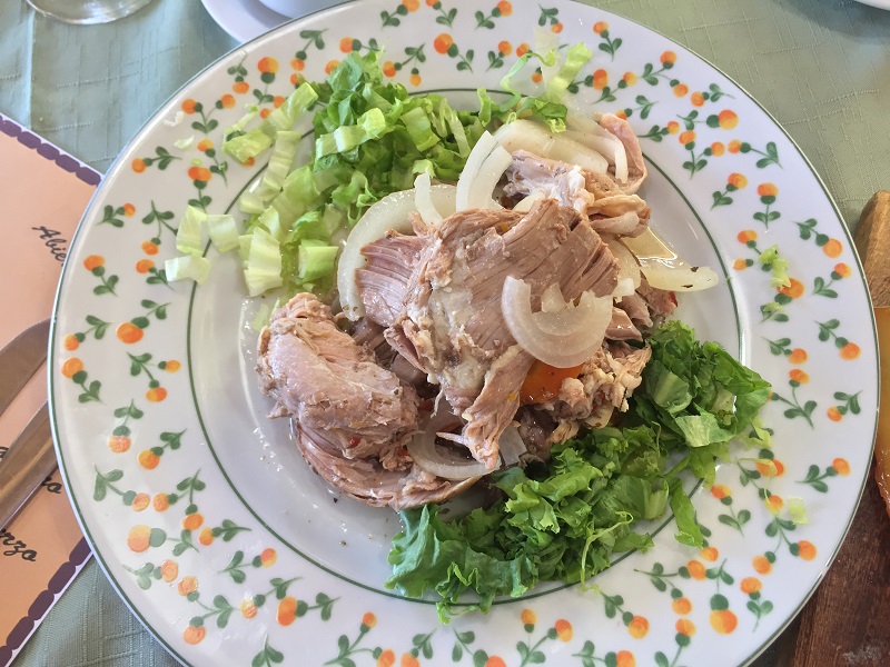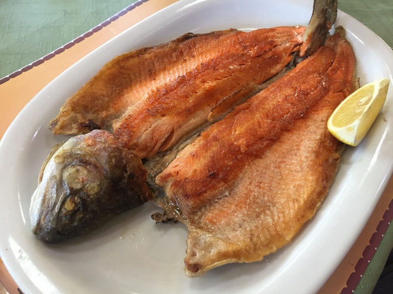 La propuesta gastronómica no la terminé de entender. La carta era un tanto larga y con mucho marisco, salmón y otros productos congelados que a mi entender poco tienen para hacer en un criadero de trucha.